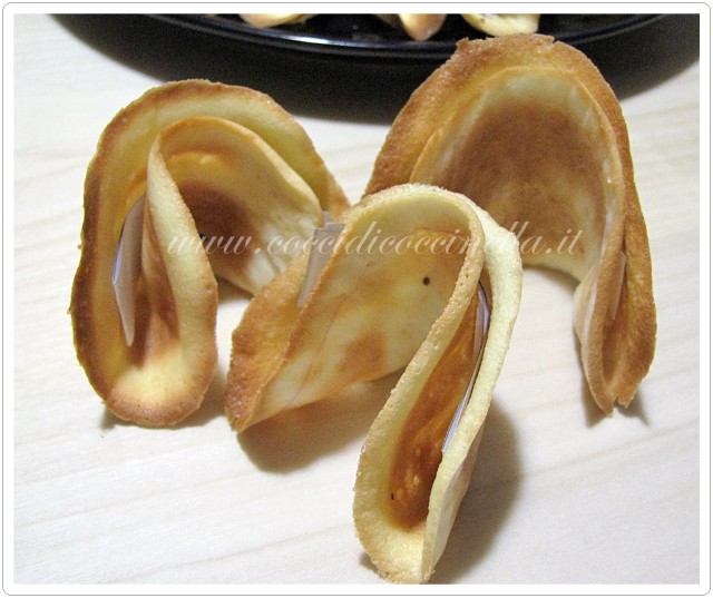 - Appena i biscotti saranno pronti, toglieteli dal forno, mettete su ognuno il bigliettino della fortuna e immediatamente ripiegateli a metà formando due semicerchi. Sollevateli con una spatola, afferrate le estremità e unitele premendo affinché aderiscano.