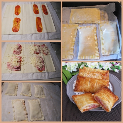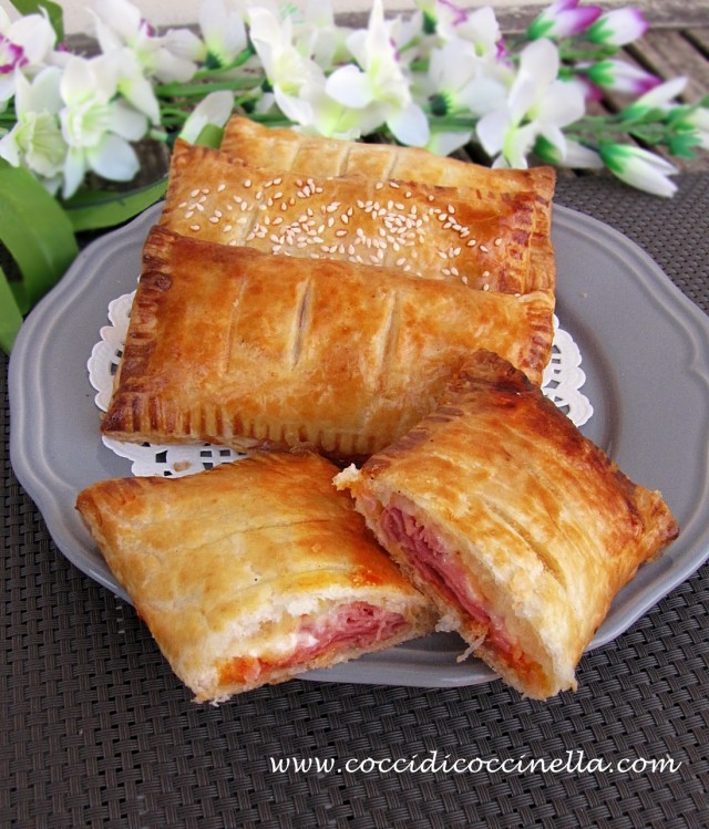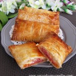 Un rustico veloce da fare e buonissimo da gustare. Questi fagottini di pasta sfoglia sono ottimi per il buffet di una festa o per una serata tra amici. All’interno ci ho messo un po’ di pomodoro, prosciutto cotto ed emmenthal, ma al posto di quest’ultimo potrete usare provola, mozzarella o sottilette. Dipenda da cosa vi va o da cosa vi trovate nel frigo!