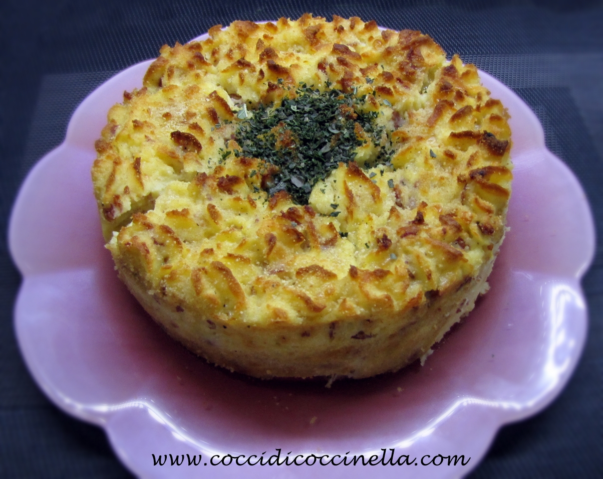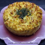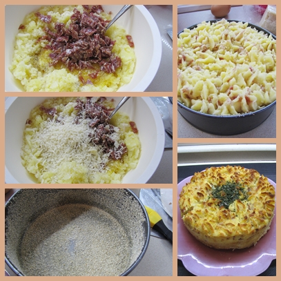- Imburrare e spolverare con il pane grattugiato una tortiera a cerniera da 20 cm di diametro. Mettere 2/3 di composto nello stampo, livellarlo col dorso di un cucchiaio e ricoprire con l'ultima parte del composto messa in un sac a poche munito di bocchetta a stella, distribuendolo su tutta al superficie.