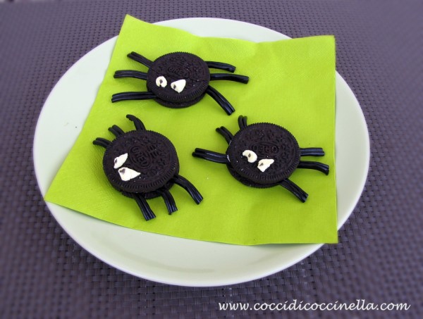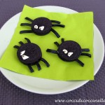- Tagliare con un paio di forbici le zampette dei ragnetti (6 per ognuno) e posizionarli su metà biscotto. Richiudere poi il biscotto con l'altra metà.
