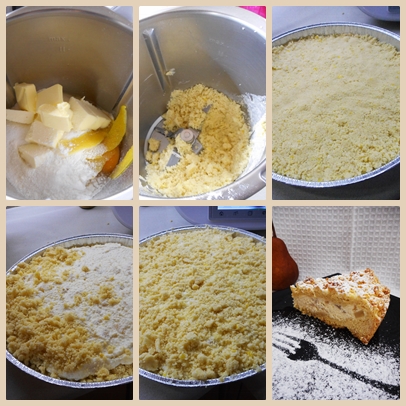 - Nel frattempo che le pere si raffreddino mescolare in una ciotola tutti gli ingredienti per fare la frolla strofinandoli col burro, finche esso non si consumi. Si otterrà un composto sabbioso.