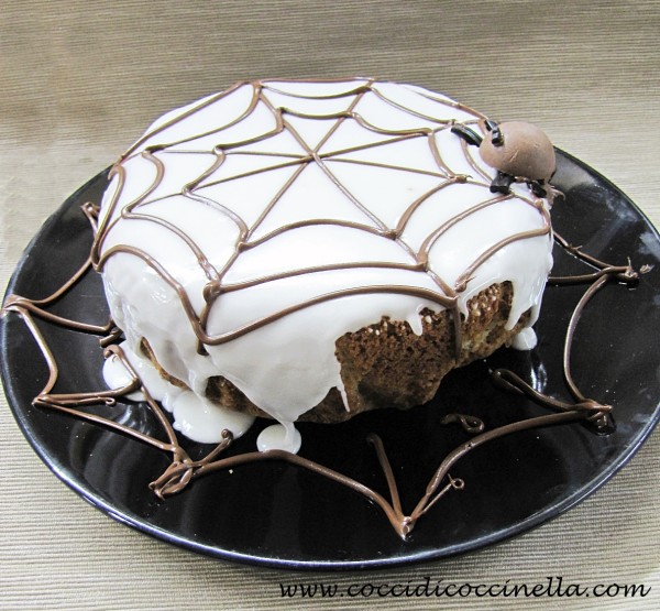 - Usare la glassa per ricoprire la torta. Lasciar rassodare e poi decorare la superficie usando la crema spalmabile in un sac a poche. Disegnare una ragnatela. Decorare a piacere.